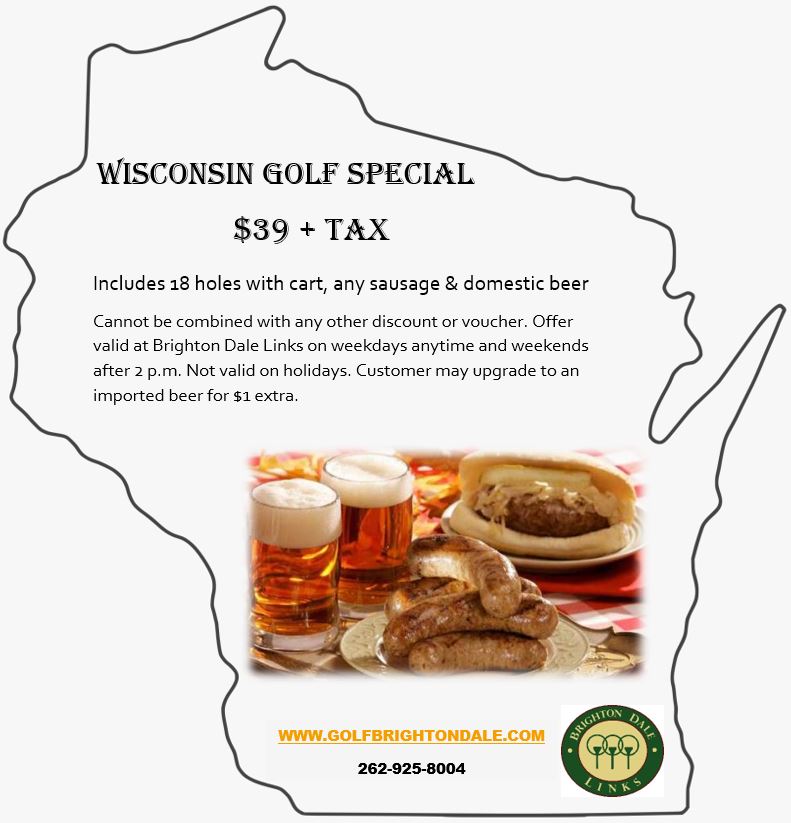 We've got a delicious summer treat for you -- the Wisconsin Golf Special! For $39 plus tax, you get to play 18 holes with a motor cart and enjoy your choice of one sausage and one domestic beer.